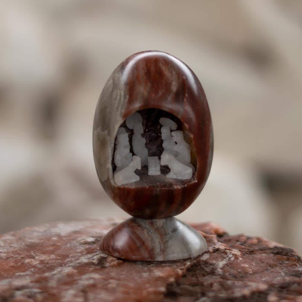 Nacimiento en piedra alabastro rojo jaspeado, gruta de forma de huevo en piedra alabastro blanco. Piedra de Huamanga | Parwa