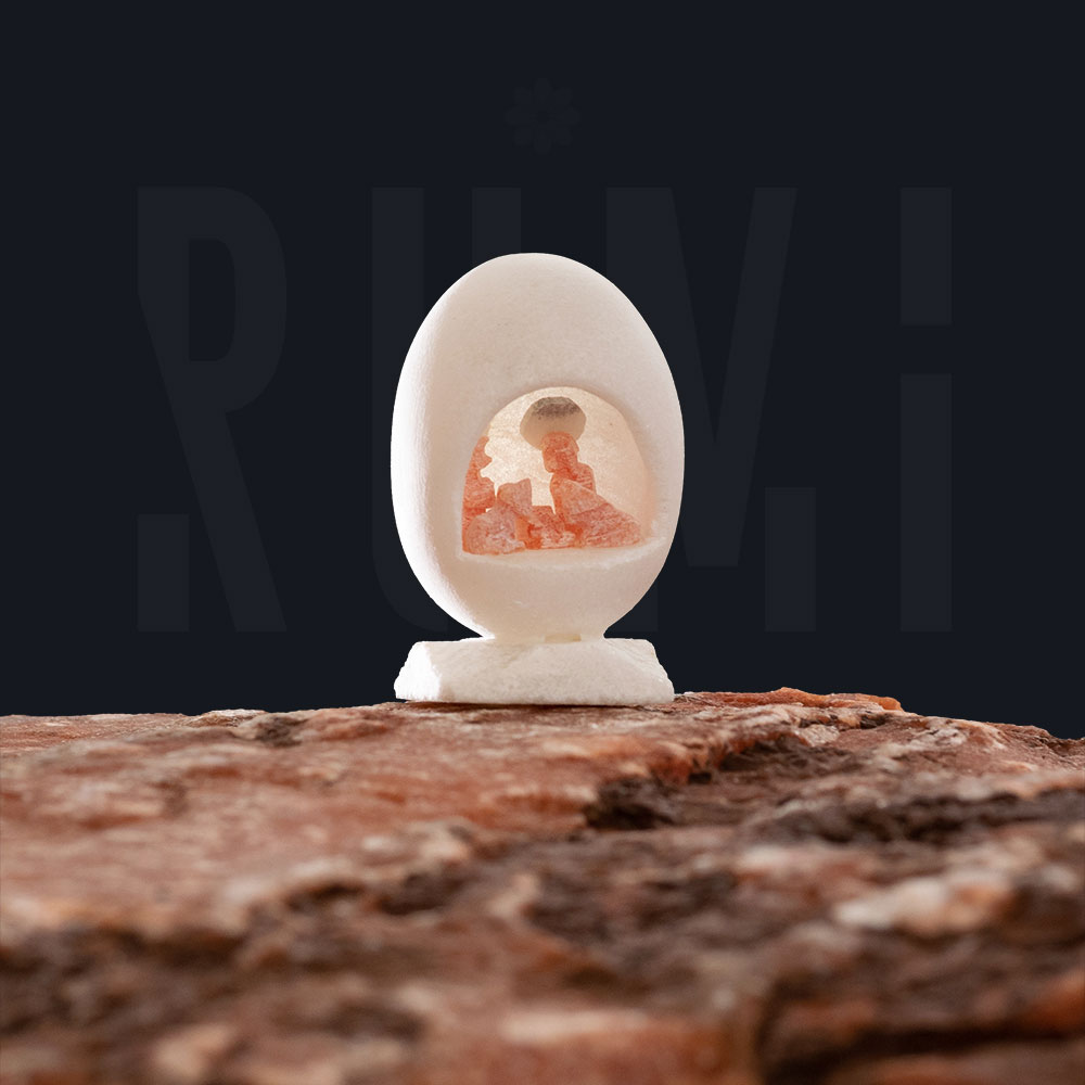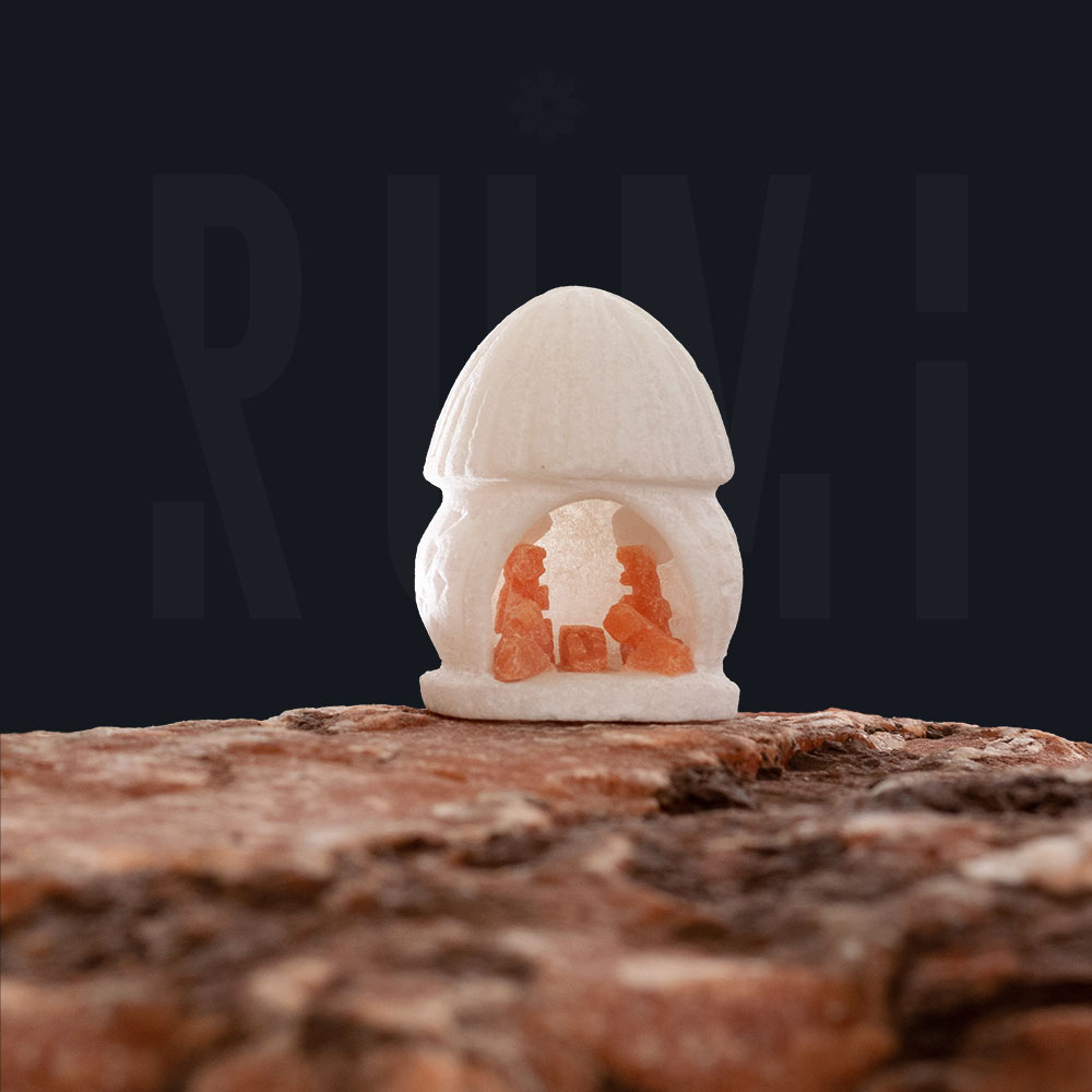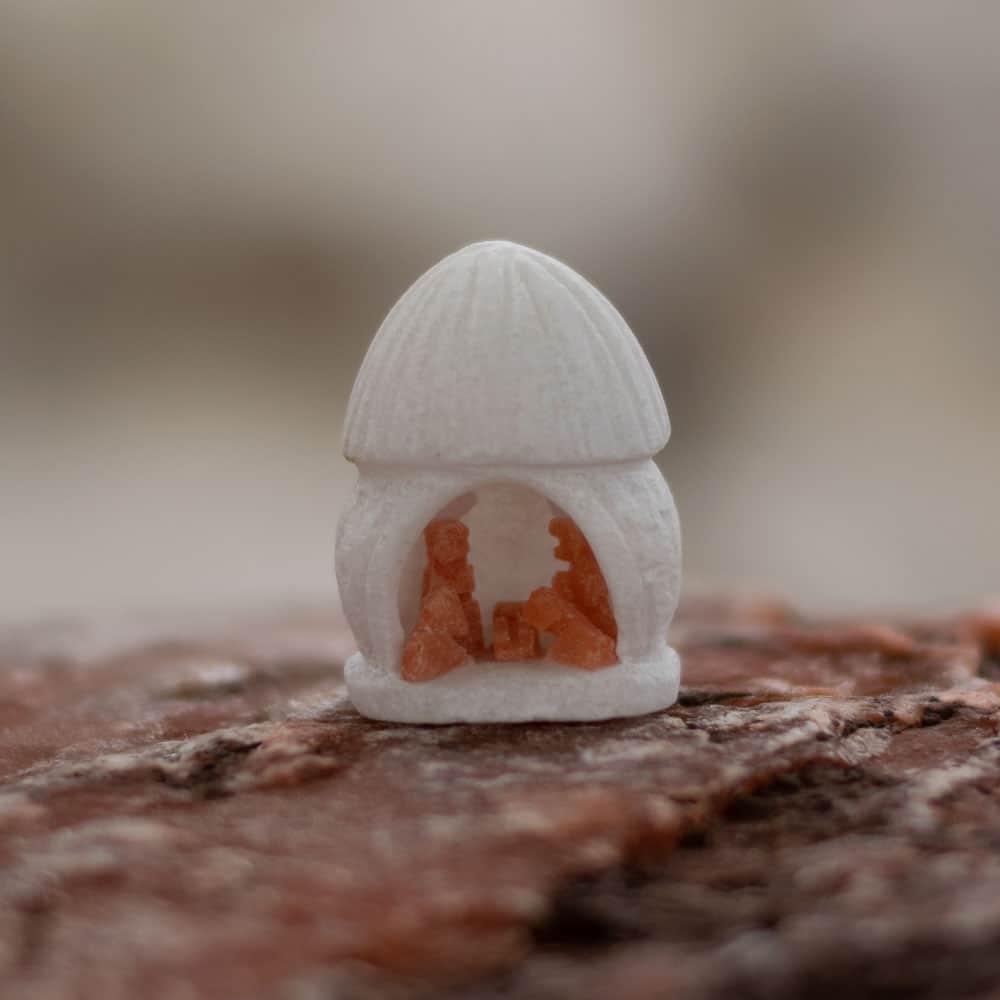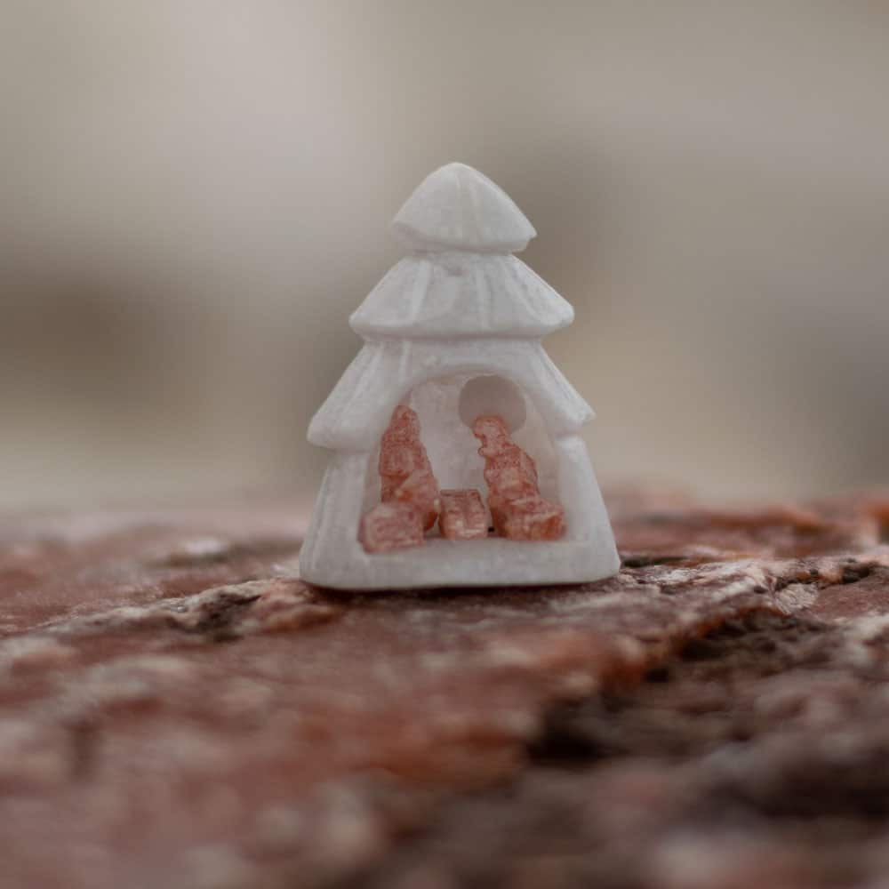 Nacimiento navideño variado: huevo, hongo y árbol (3 piezas). Nacimiento en piedra alabastro rojo jaspeado, gruta de forma de huevo en piedra alabastro blanco. Piedra de Huamanga | Parwa