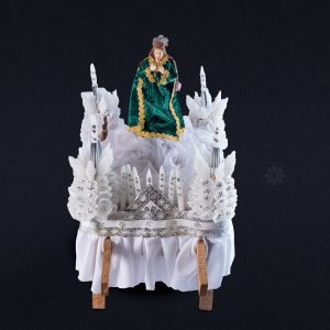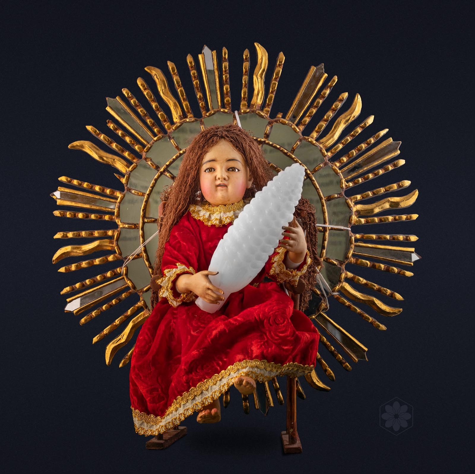 Niño Jesús de la abundancia con las saramamas. Incluye el accesorio en pan de oro "círculo solar". Cerería Ayacuchana. Familia Hurtado.