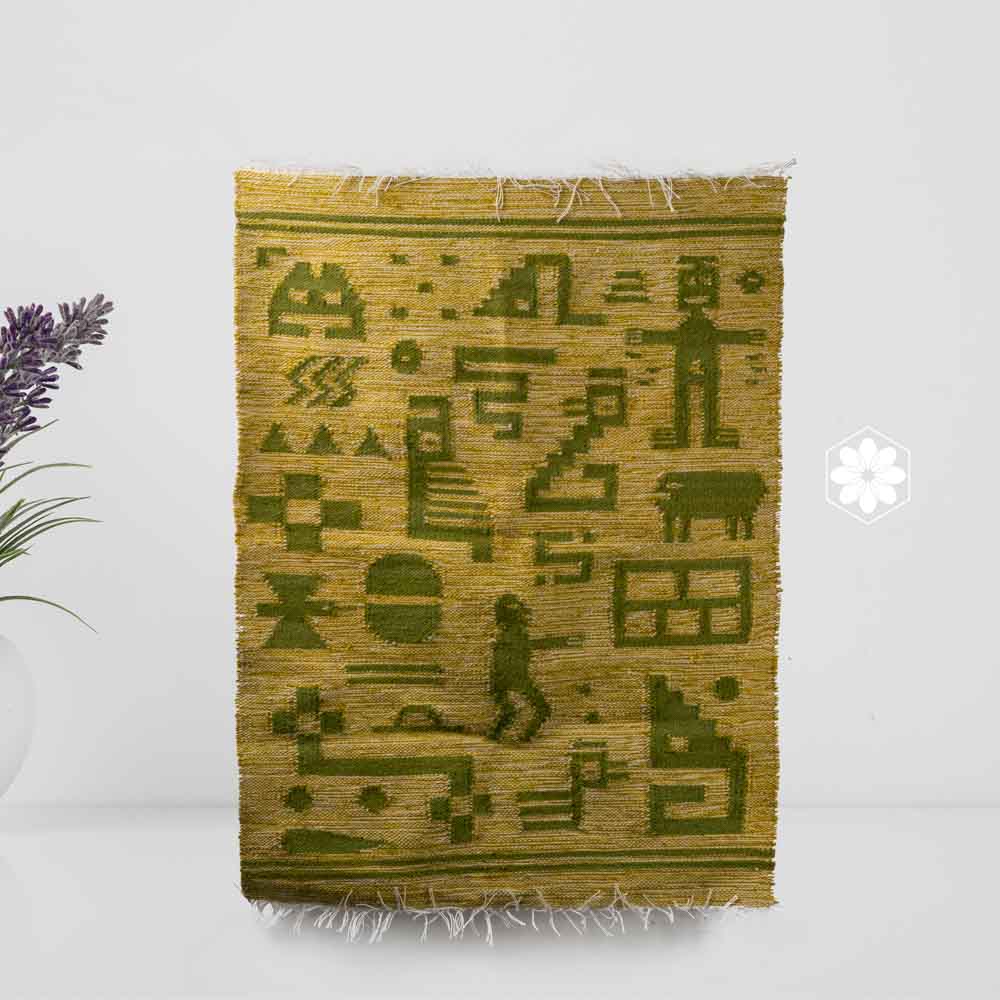 Juliana Gómez (Sumaq Awaq). Producido con hilos de lana a través de degradaciones cromáticas, metáforas visuales que transmiten información, conocimiento, prácticas, experiencias vivenciales y demostrativas de una memoria colectiva, de un pueblo, una comunidad y toda una nación. Arte textil Ayacucho.